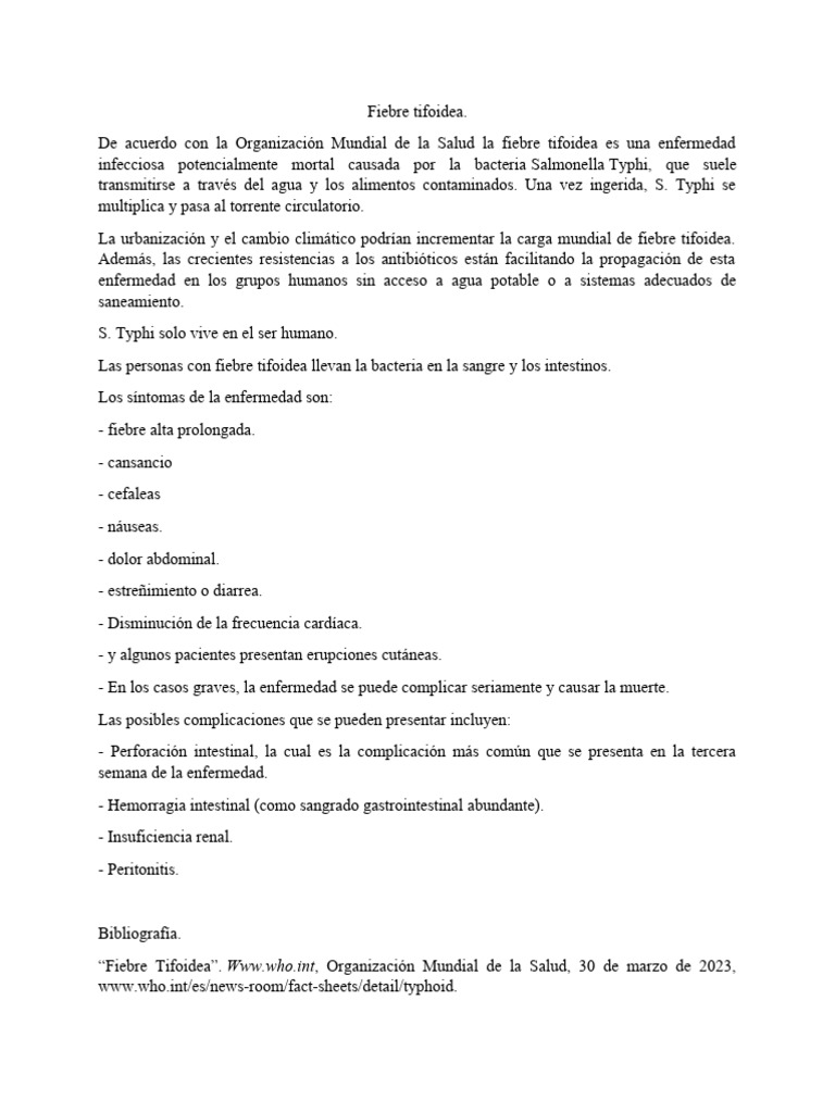 De acuerdo con la Organización Mundial de la Salud la fiebre tifoidea es una enfermedad