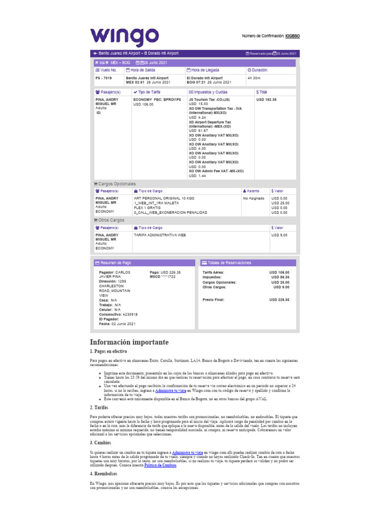Pagador: CARLOS Pago: USD 226.35 Tarifa Aérea: USD 106.00