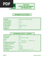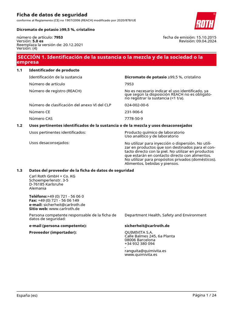 Identificación de la sustancia Dicromato de potasio ≥99,5 %, cristalino