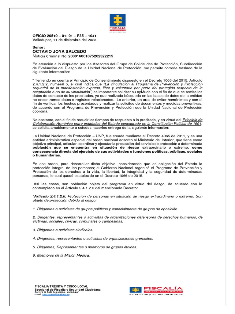 de Evaluación del Riesgo de la Unidad Nacional de Protección, me permito correrle traslado de la