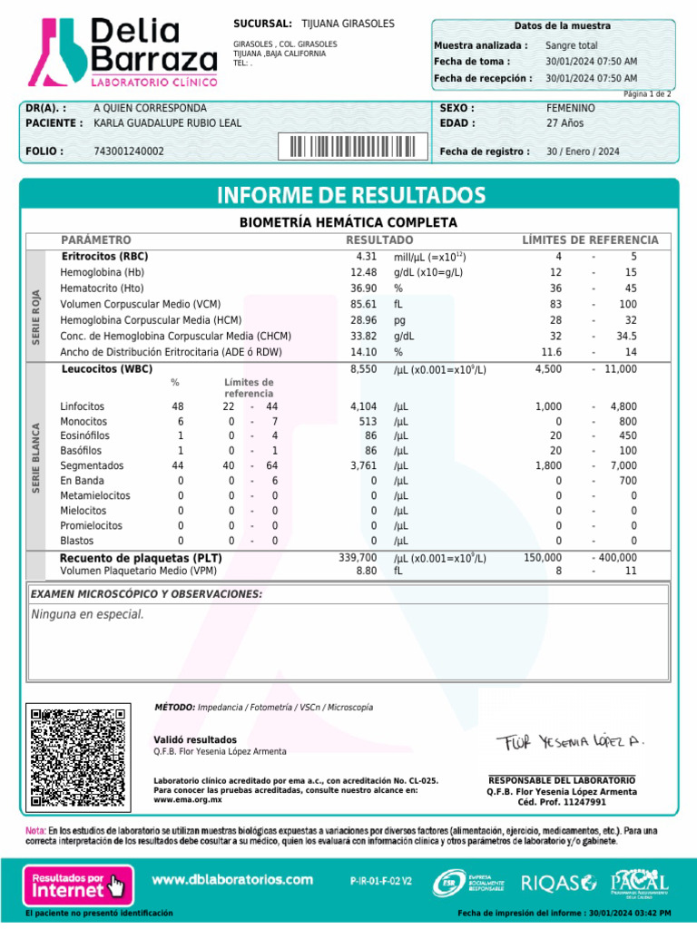 El paciente no presentó identificación Fecha de impresión del informe : 30/01/2024 03:42 PM