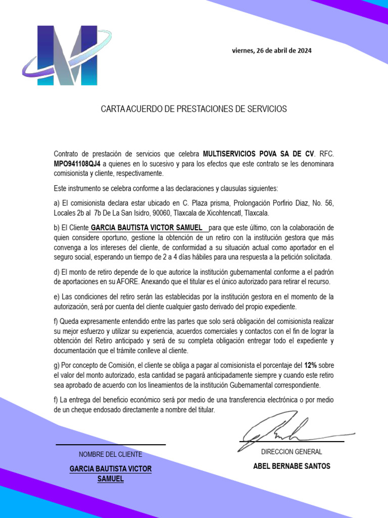 Contrato de prestación de servicios que celebra MULTISERVICIOS POVA SA DE CV. RFC.