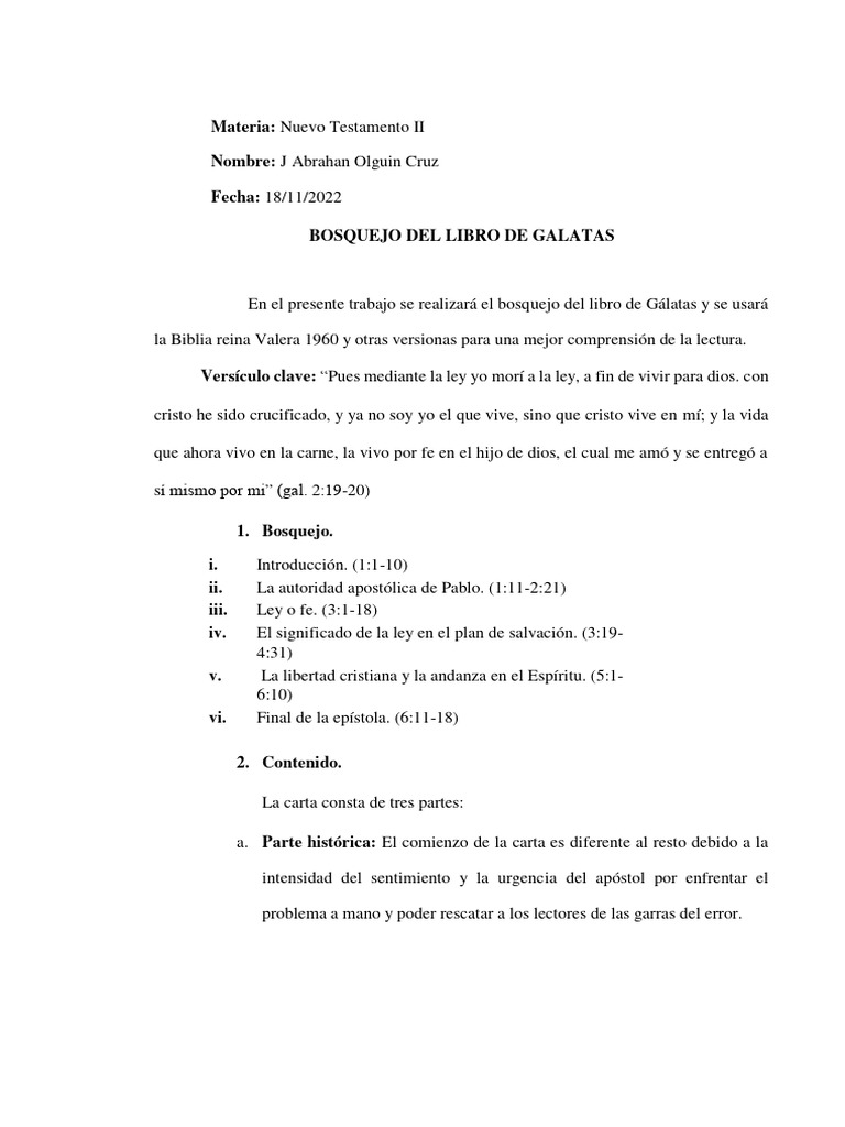 En el presente trabajo se realizará el bosquejo del libro de Gálatas y se usará