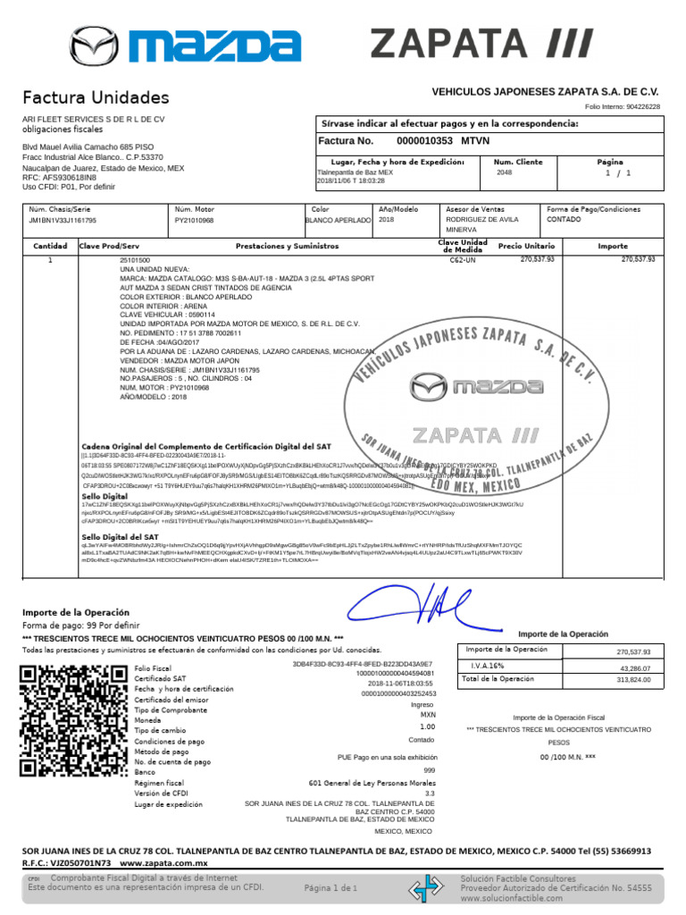 UNIDAD IMPORTADA POR MAZDA MOTOR DE MEXICO, S. DE R.L. DE C.V.