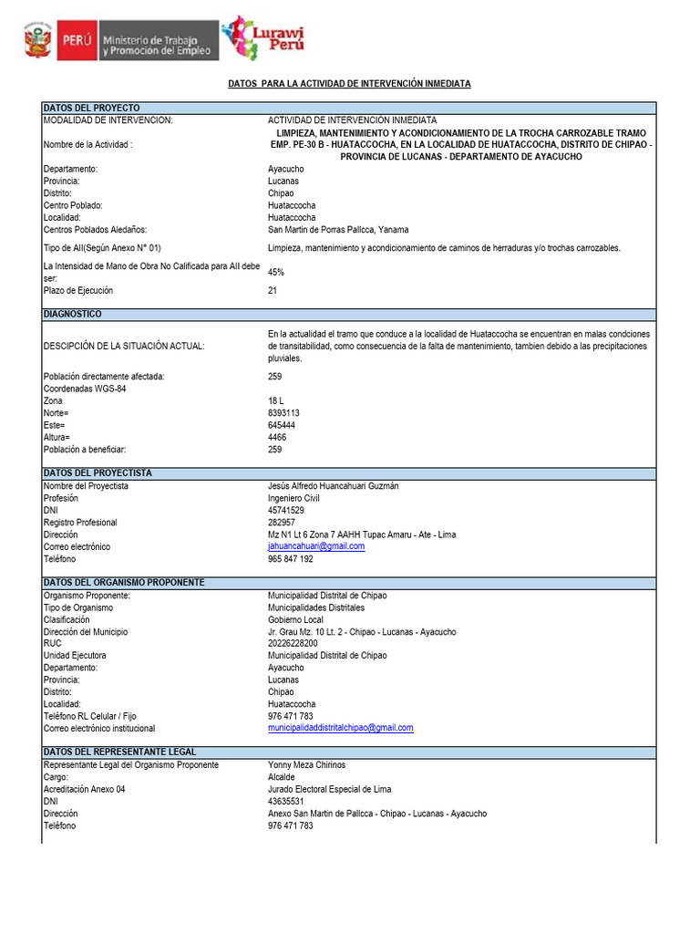 ACTIVIDAD DE INTERVENCIÓN INMEDIATA: LIMPIEZA, MANTENIMIENTO Y ACONDICIONAMIENTO DE LA TROCHA CARROZABLE TRAMO EMP. PE-30 B - HUATACCOCHA, EN LA LOCALIDAD DE HUATACCOCHA, DISTRITO DE CHIPAO -