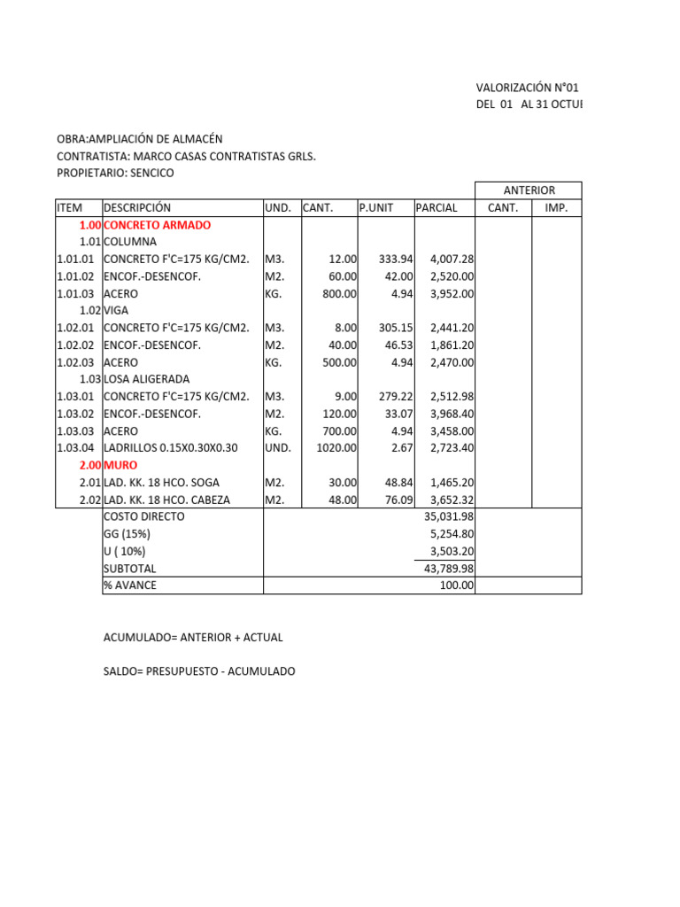 CUADRO RESUMEN DE VALORIZACION N° 01 ()