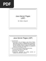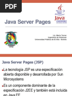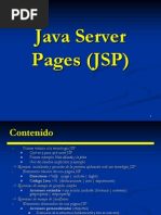 Este documento describe las características de las páginas JSP y los elementos que se pueden incluir en ellas como código Java, directivas y acciones. También explica los objetos implícitos disponibles en JSP y cómo se genera dinámicamente el contenido de las páginas.