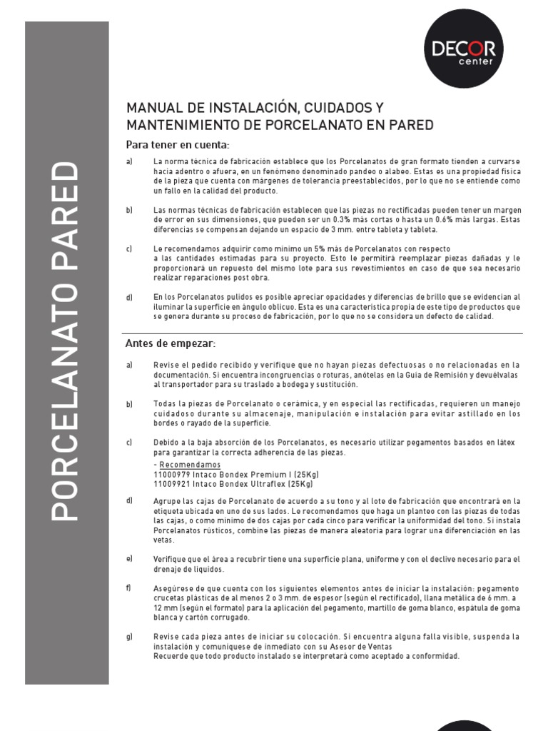 a) Revise el pedido recibido y verifique que no hayan piezas defectuosas o no relacionadas en la documentacin. Si encuentra incongruencias o roturas, antelas en la Gua de Remisin y devulvalas al transportador para su traslado a bodega y sustitucin. Todas la piezas de Porcelanato o cermica, y en especial las rectificadas, requieren un manejo cuidadoso durante su almacenaje, manipulacin e instalacin para evitar astillado en los bordes o rayado de la superficie. Debido a la baja absorcin de los Porcelanatos, es necesario utilizar pegamentos basados en ltex para garantizar la correcta adherencia de las piezas. - Recomendamos 11000979 Intaco Bondex Premium I (25Kg) 11009921 Intaco Bondex Ultraflex (25Kg) d) Agrupe las cajas de Porcelanato de acuerdo a su tono y al lote de fabricacin que encontrar en la etiqueta ubicada en uno de sus lados. Le recomendamos que haga un planteo con las piezas de todas las cajas, o como mnimo de dos cajas por cada cinco para verificar la uniformidad del tono. Si instala Porcelanatos rsticos, combine las piezas de manera aleatoria para lograr una diferenciacin en las vetas. Verifique que el rea a recubrir tiene una superficie plana, uniforme y con el declive necesario para el drenaje de lquidos. Asegrese de que cuenta con los siguientes elementos antes de iniciar la instalacin: pegamento crucetas plsticas de al menos 2 o 3 mm. de espesor (segn el rectificado), llana metlica de 6 mm. a 12 mm (segn el formato) para la aplicacin del pegamento, martillo de goma blanco, esptula de goma blanca y cartn corrugado. Revise cada pieza antes de iniciar su colocacin. Si encuentra alguna falla visible, suspenda la instalacin y comunquese de inmediato con su Asesor de Ventas Recuerde que todo producto instalado se interpretar como aceptado a conformidad.