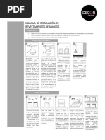 1. Antes de iniciar la instalacin, barra y trapee el piso para eliminar el polvo y los residuos de obra, ya que estos restan adherencia al pegamento. Sature de agua la superficie de soporte sobre la que instalar los Porcelanatos, de manera tal que permanezca hmeda durante la colocacin, pero sin que se presenten empozamientos. Prepare el pegamento de acuerdo con ls instrucciones impresas en el envase. Mantenga una distancia minima de 2 mm. entre las rectificadas y de 3 mm. entre las no rectificadas, as como una junta perimetral de 8 mm. con las paredes para prevenir un desprendimiento futuro del producto. Si la superficie tiene juntas estructurales debe respetarlas. Se recuerda que el rea mxima de instalacin sin este tipo de dilataciones es de 25 m2. Los Porcelanatos cuentan con marcas grabadas en su cara oculta. Utilcelas como referencia para lograr que todas las fichas se instalen en el mismo sentido, o guese por el horizonte de la pieza. No recomendamos instalar los Porcelanatos en un patrn escalonado o traslapados, ya que esto puede generar topes. Si usted desea instalar las baldosas de esta manera, le aconsejamos que el traslape de las mismas sea a de pieza y una fragua mnima de 4mm. 6. Esparza una capa delgada de pegamento sobre la superficie de soporte, creando surcos que vallan siempre en la misma direccin con la llana dentada. Repita el procedimiento en la cara oculta de la pieza, pero con el lado plano de la herramienta. Adhiera las piezas presionando levemente hacia abajo y en sentido perpendicular a los surcos. Golpee suavemente con el martillo de goma de color blanco para asentar el pegamento. Revise la instalacin al final de la jornada de trabajo, ya que an est a tiempo de corregir posibles errores. Deje que el pegamento se solidifique durante al menos 24 horas, no camine ni ponga objetos sobre el piso antes de ese periodo, ya que podra ocasionar desniveles. Retire la capa protectiva de los Porcelanatos frotando con un cepillo mecnico y detergente neutro Limpie el espacio entre las piezas con una brocha delgada. Asegrese de retirar la arena y los restos de obra, ya que estos impiden la adherencia de la fragua. Si su Porcelanato es de superficie rugosa o de tonalidad pura o fuerte (por ejemplo blanco o negro), recubra los bordes de todas las piezas con cinta de enmascarar. Esto le ayudar a prevenir el manchado. En pisos ajedrezados, proteja las piezas claras si utiliza una fragua de tonos oscuros, o viceversa. Elija el material de fragua que ms se aproxime al color de sus Porcelanatos y preprelo siguiendo las instrucciones del fabricante. DECOR CENTER recomienda el uso de Fragua Intaco Groutex Polmero.