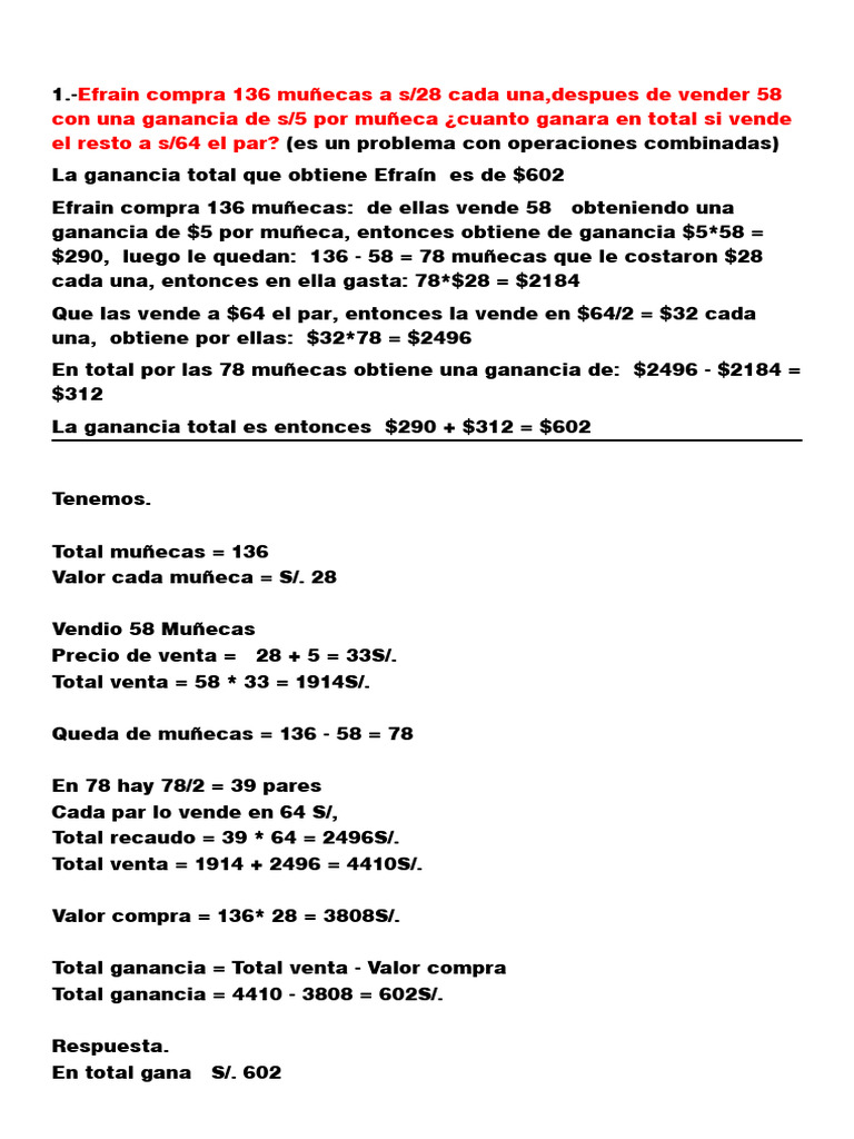 -Efrain compra 136 muñecas a s/28 cada una,despues de vender 58