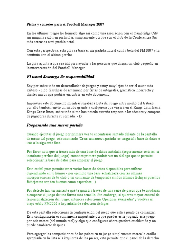 el Cambridge City sin ninguna razn en particular, simplemente porque son el club de la Conferencia Sur ms cercanos a mi pueblo natal. Con esta perspectiva, esta gua se basa en mi partida inicial con la beta del FM2007 y la contino con el ltimo parche. La gua apunta a que sea til para ayudar a las personas que dirijan un club pequeo en la nueva versin del Football Manager.