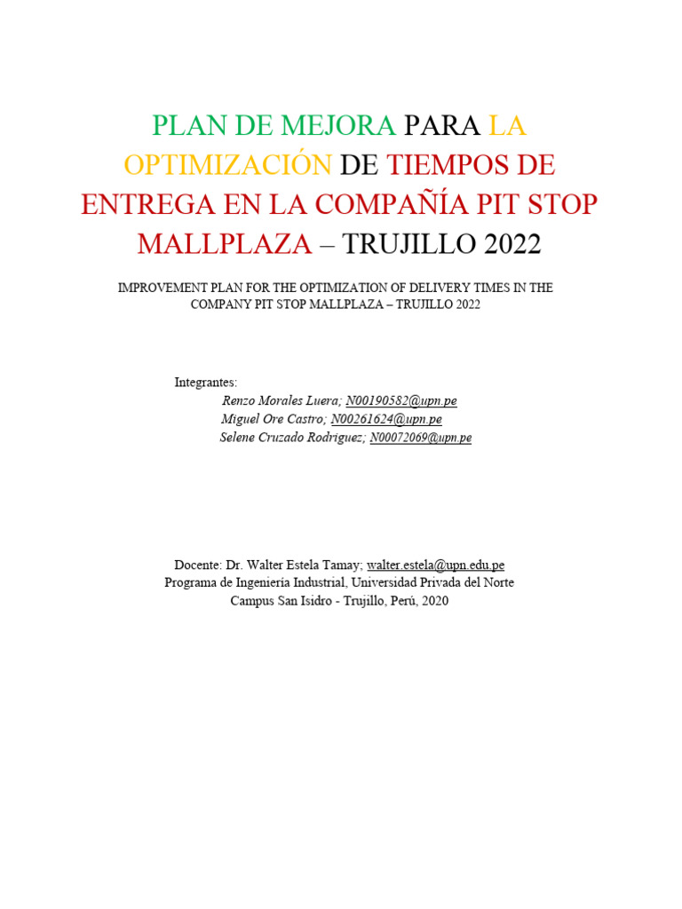 DE TIEMPOS DE ENTREGA EN LA COMPAÑÍA PIT STOP MALLPLAZA – TRUJILLO 2022