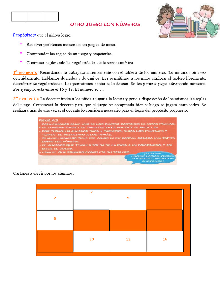 2º momento: La docente invita a los niños a jugar a la lotería y pone a disposición de los mismos las reglas