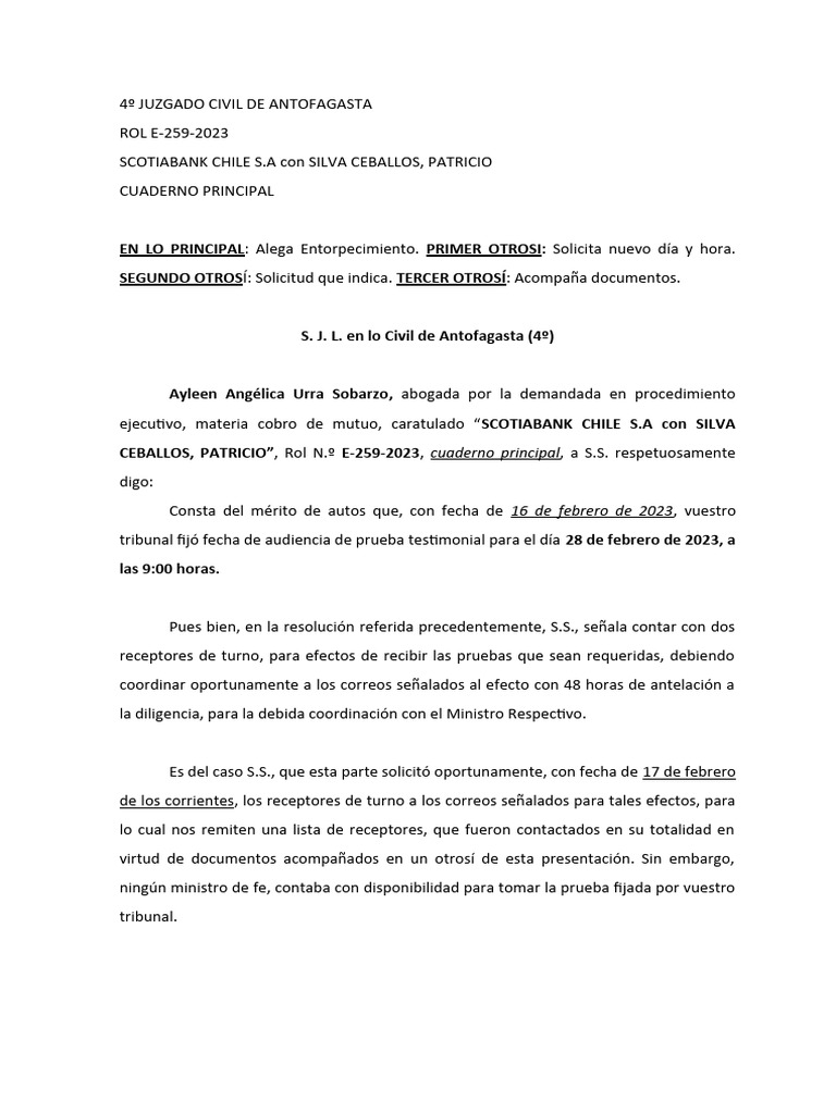 EN LO PRINCIPAL: Alega Entorpecimiento. PRIMER OTROSI: Solicita nuevo día y hora.