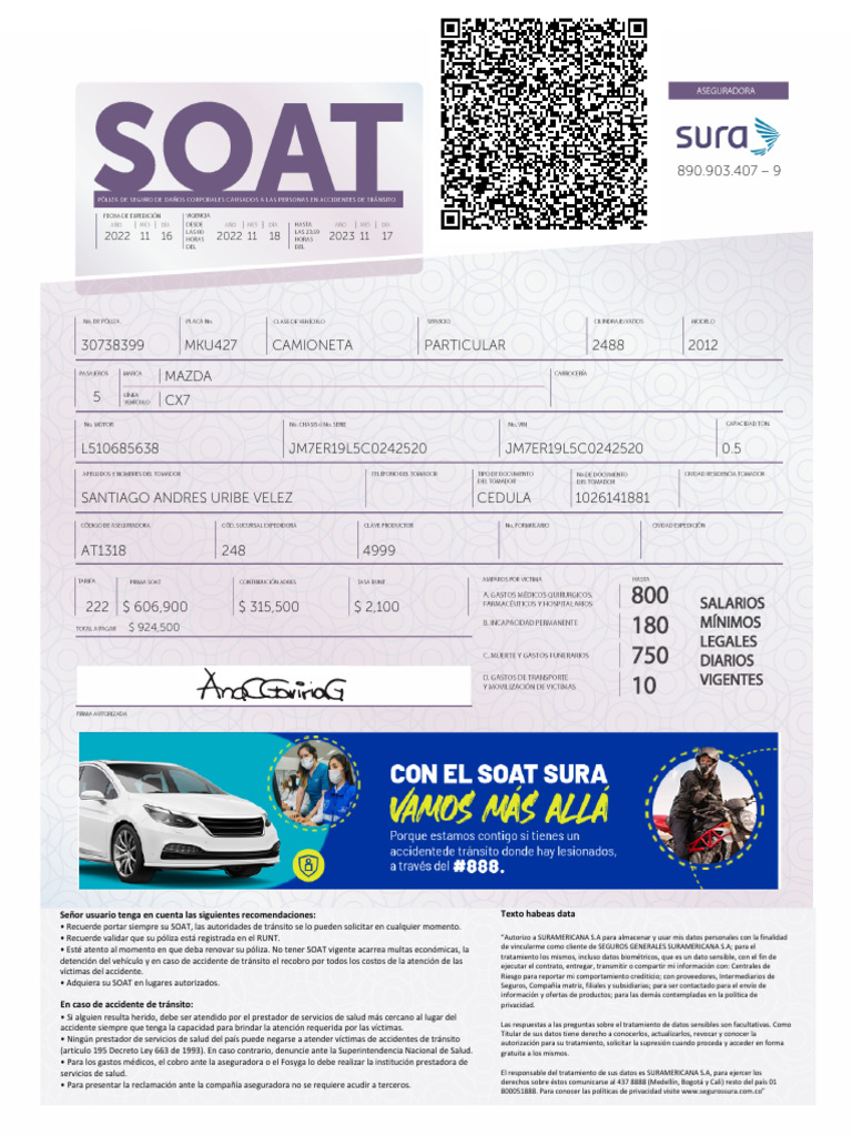 • Recuerde validar que su póliza está registrada en el RUNT. “Autorizo a SURAMERICANA S.A para almacenar y usar mis datos personales con la finalidad