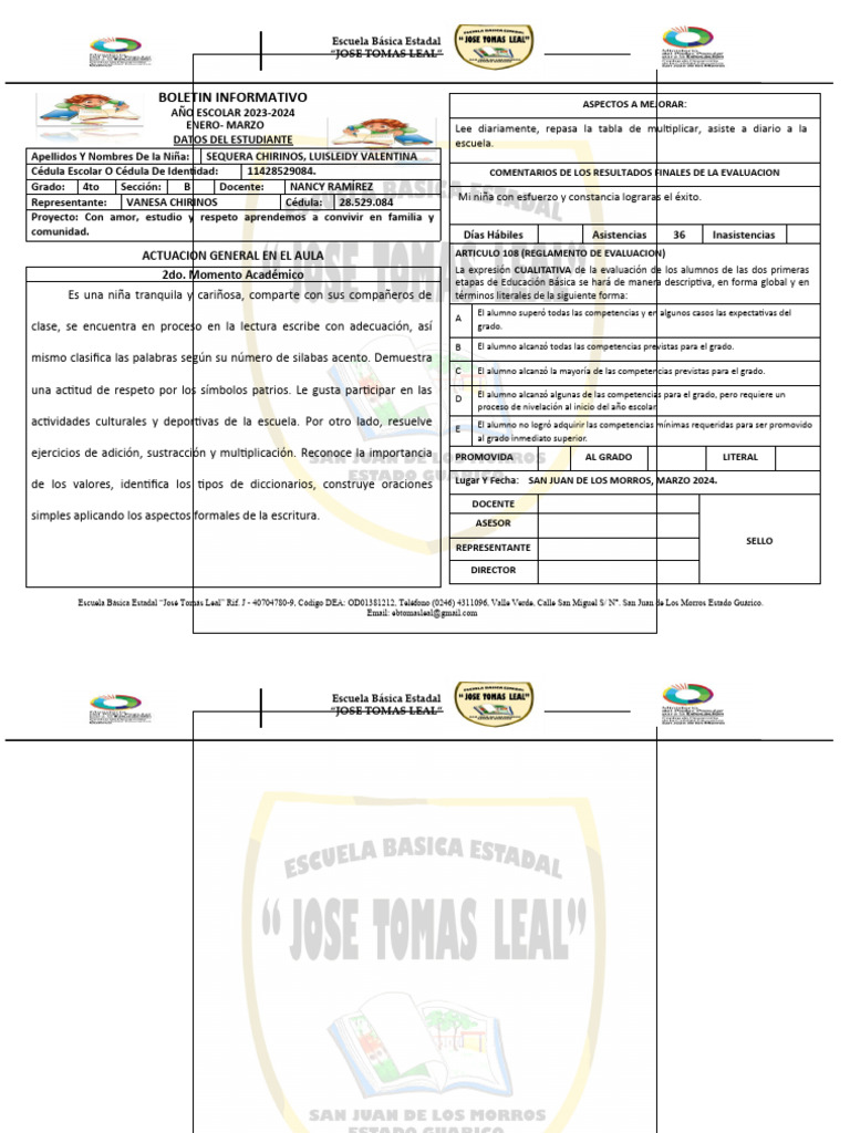 Escuela Básica Estadal “José Tomás Leal” Rif. J - 40704780-9, Código DEA: OD01381212, Teléfono (0246) 4311096, Valle Verde, Calle San Miguel S/ N°. San Juan de Los Morros Estado Guárico.