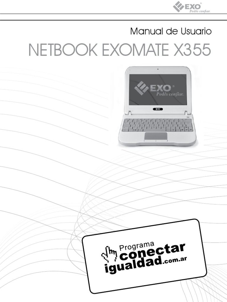 InstruccIones de segurIdad Advertencias generales Advertencias sobre el cable y el cargador Advertencias sobre la batera Desecho de bateras Reciclaje del equipo y/o de la batera Indicaciones de seguridad de equipos con comunicacin inalmbrica gua rPIda de InstaLacIn Conexin del adaptador de alimentacin Encendido del equipo Cuidados de la pantalla LCD IntroduccIon aL uso de La netBooK Vista de frente Vista izquierda Vista derecha Vista posterior Batera Los controles de funcin (HOT-KEY) Teclado - Pad de mouse - Botones del mouse Indicadores de LED status Como limpiar su equipo FuncIonaMIento de La Batera Control de la carga de la batera Medidor de potencia Advertencia de batera baja Preparacin de batera baja para el uso (Calibracin) Carga de la batera Almacenamiento de la batera Funcionamiento con bateras adicionales Maximizacin de la vida de la batera y Estados recuPeracIn de sIsteMa eXoMate X355 Acceso al men de tareas del sistema de recuperacin Restauracin Microsoft Windows 7 Restauracin GNU / Linux Restauracin de ambos Sistemas Operativos resoLucIn de ProBLeMas Resolucin de problemas 3 3 4 5 5 6 6 7 7 7 7 8 8 9 10 11 11 12 13 14 14 15 15 15 15 15 16 16 16 16 17 17 18 20 22 24 24