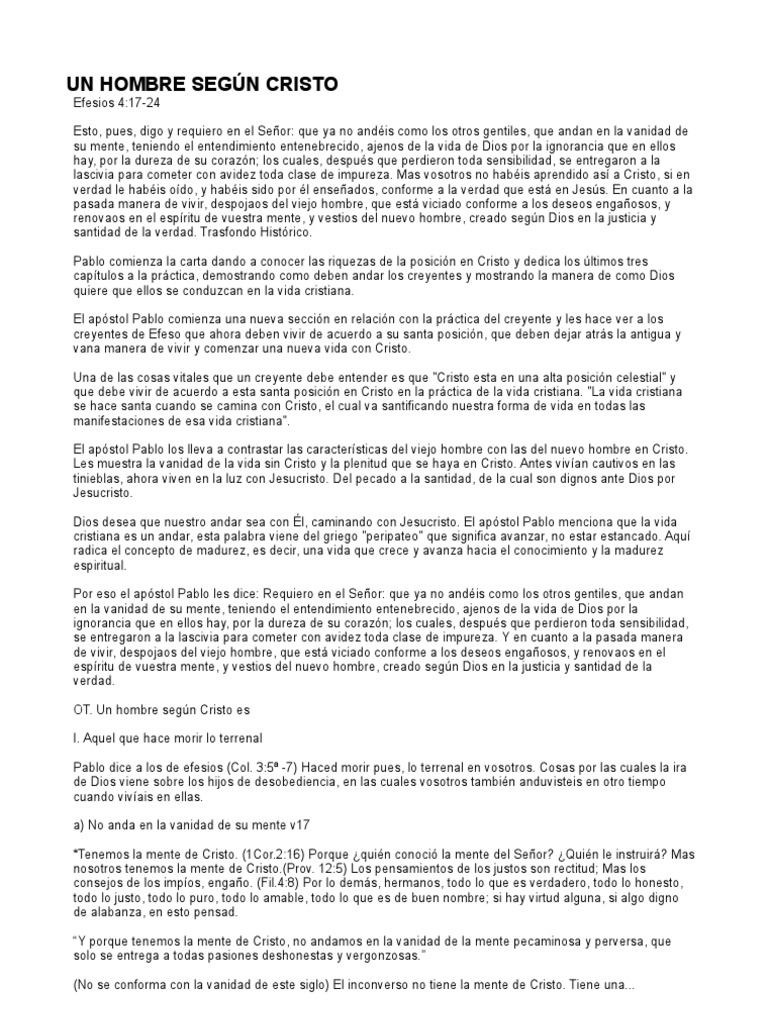 Efesios 4:17-24 Esto, pues, digo y requiero en el Seor: que ya no andis como los otros gentiles, que andan en la vanidad de su mente, teniendo el entendimiento entenebrecido, ajenos de la vida de Dios por la ignorancia que en ellos hay, por la dureza de su corazn; los cuales, despus que perdieron toda sensibilidad, se entregaron a la lascivia para cometer con avidez toda clase de impureza. Mas vosotros no habis aprendido as a Cristo, si en verdad le habis odo, y habis sido por l enseados, conforme a la verdad que est en Jess. En cuanto a la pasada manera de vivir, despojaos del viejo hombre, que est viciado conforme a los deseos engaosos, y renovaos en el espritu de vuestra mente, y vestios del nuevo hombre, creado segn Dios en la justicia y santidad de la verdad. Trasfondo Histrico. Pablo comienza la carta dando a conocer las riquezas de la posicin en Cristo y dedica los ltimos tres captulos a la prctica, demostrando como deben andar los creyentes y mostrando la manera de como Dios quiere que ellos se conduzcan en la vida cristiana. El apstol Pablo comienza una nueva seccin en relacin con la prctica del creyente y les hace ver a los creyentes de Efeso que ahora deben vivir de acuerdo a su santa posicin, que deben dejar atrs la antigua y vana manera de vivir y comenzar una nueva vida con Cristo. Una de las cosas vitales que un creyente debe entender es que "Cristo esta en una alta posicin celestial" y que debe vivir de acuerdo a esta santa posicin en Cristo en la prctica de la vida cristiana. "La vida cristiana se hace santa cuando se camina con Cristo, el cual va santificando nuestra forma de vida en todas las manifestaciones de esa vida cristiana". El apstol Pablo los lleva a contrastar las caractersticas del viejo hombre con las del nuevo hombre en Cristo. Les muestra la vanidad de la vida sin Cristo y la plenitud que se haya en Cristo. Antes vivan cautivos en las tinieblas, ahora viven en la luz con Jesucristo. Del pecado a la santidad, de la cual son dignos ante Dios por Jesucristo. Dios desea que nuestro andar sea con l, caminando con Jesucristo. El apstol Pablo menciona que la vida cristiana es un andar, esta palabra viene del griego "peripateo" que significa avanzar, no estar estancado. Aqu radica el concepto de madurez, es decir, una vida que crece y avanza hacia el conocimiento y la madurez espiritual. Por eso el apstol Pablo les dice: Requiero en el Seor: que ya no andis como los otros gentiles, que andan en la vanidad de su mente, teniendo el entendimiento entenebrecido, ajenos de la vida de Dios por la ignorancia que en ellos hay, por la dureza de su corazn; los cuales, despus que perdieron toda sensibilidad, se entregaron a la lascivia para cometer con avidez toda clase de impureza. Y en cuanto a la pasada manera de vivir, despojaos del viejo hombre, que est viciado conforme a los deseos engaosos, y renovaos en el espritu de vuestra mente, y vestios del nuevo hombre, creado segn Dios en la justicia y santidad de la verdad. OT. Un hombre segn Cristo es I. Aquel que hace morir lo terrenal Pablo dice a los de efesios (Col. 3:5 -7) Haced morir pues, lo terrenal en vosotros. Cosas por las cuales la ira de Dios viene sobre los hijos de desobediencia, en las cuales vosotros tambin anduvisteis en otro tiempo cuando vivais en ellas. a) No anda en la vanidad de su mente v17 *Tenemos la mente de Cristo. (1Cor.2:16) Porque quin conoci la mente del Seor? Quin le instruir? Mas nosotros tenemos la mente de Cristo.(Prov. 12:5) Los pensamientos de los justos son rectitud; Mas los consejos de los impos, engao. (Fil.4:8) Por lo dems, hermanos, todo lo que es verdadero, todo lo honesto, todo lo justo, todo lo puro, todo lo amable, todo lo que es de buen nombre; si hay virtud alguna, si algo digno de alabanza, en esto pensad. Y porque tenemos la mente de Cristo, no andamos en la vanidad de la mente pecaminosa y perversa, que solo se entrega a todas pasiones deshonestas y vergonzosas. (No se conforma con la vanidad de este siglo) El inconverso no tiene la mente de Cristo. Tiene una...