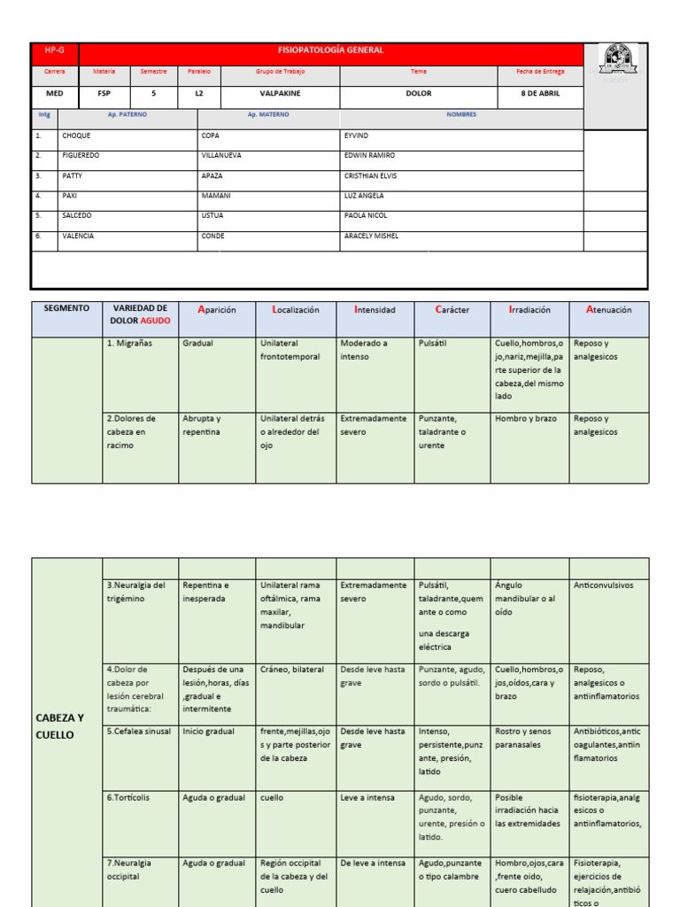Si el nombre del grupo comienza con la letra A – I o incluye un número, deben realizar 3 ejemplos de DOLOR AGUDO en cabeza y cuello; tórax, abdomen y miembros y un esquema del DOLOR NOCICEPTIVO.