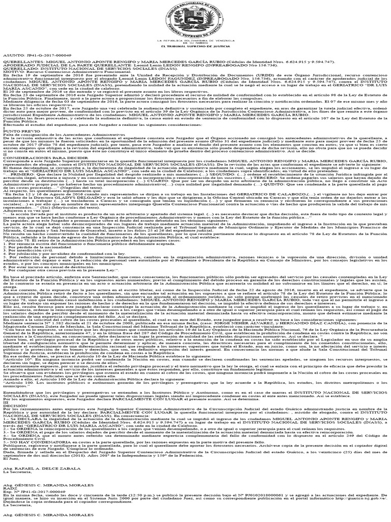 ciudadanos MIGUEL ANTONIO APONTE RENGIFO y MARIA MERCEDES GARCÍA RUBIO (Cédulas de Identidad Nros. 6.624.915 y 9.594.747), contra el INSTITUTO