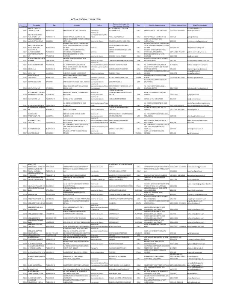 Proveedor Rut Dirección Rubro Pais Dirección Representante Telefono Representante Email Representante