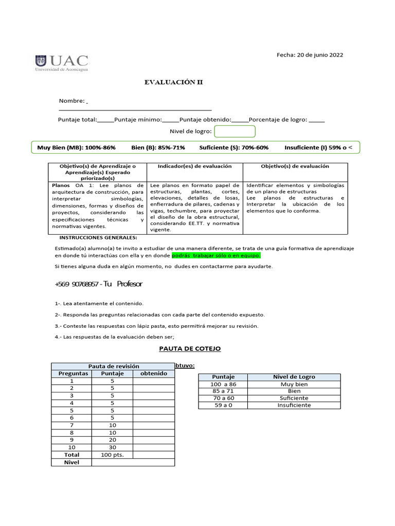 Puntaje total: Puntaje mínimo: Puntaje obtenido: Porcentaje de logro: