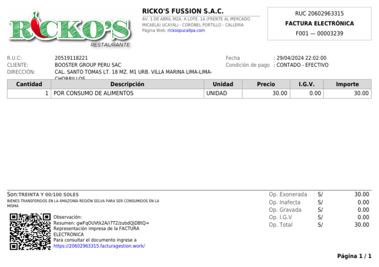 Resumen: gwFqOUVtk2A/i7T2/zubdQjDBtQ= Op. Total S/ 30.00