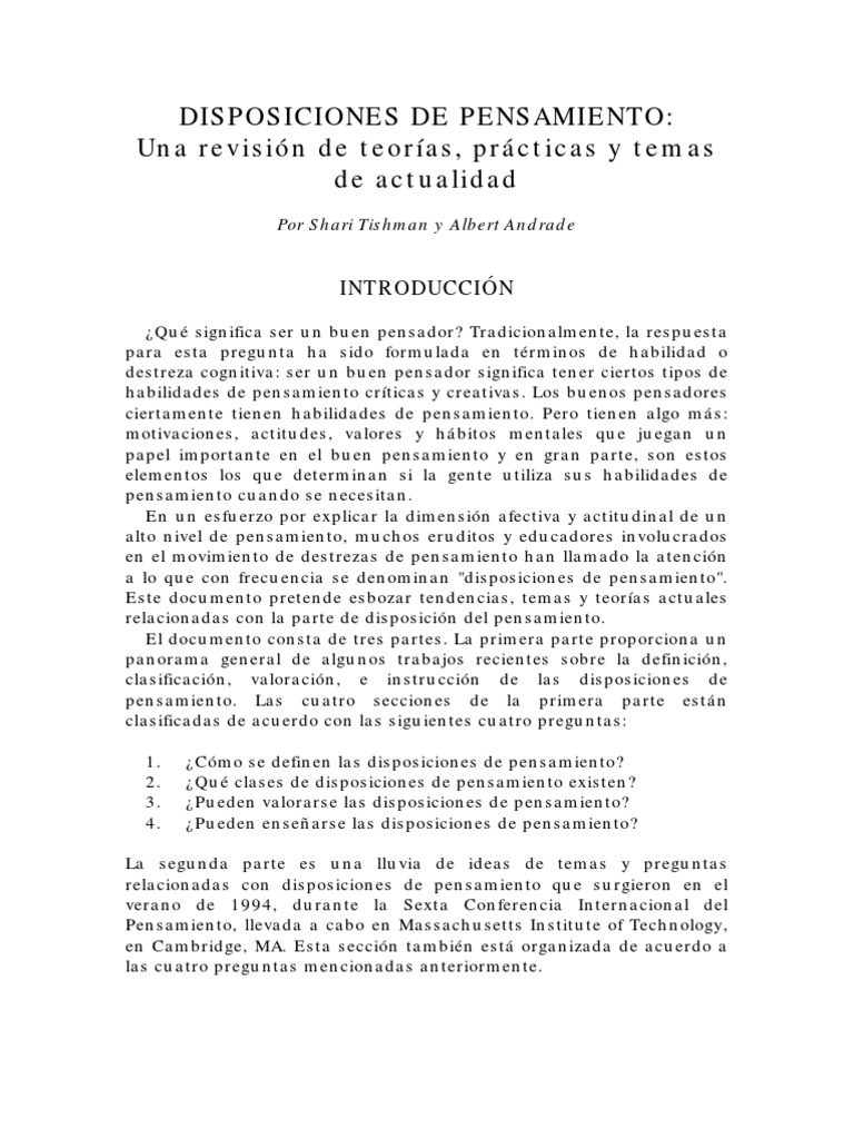 Qu significa ser un buen pensador? Tradicionalmente, la respuesta para esta pregunta ha sido formulada en trminos de habilidad o destreza cognitiva: ser un buen pensador significa tener ciertos tipos de habilidades de pensamiento crticas y creativas. Los buenos pensadores ciertamente tienen habilidades de pensamiento. Pero tienen algo ms: motivaciones, actitudes, valores y hbitos mentales que juegan un papel importante en el buen pensamiento y en gran parte, son estos elementos los que determinan si la gente utiliza sus habilidades de pensamiento cuando se necesitan. En un esfuerzo por explicar la dimensin afectiva y actitudinal de un alto nivel de pensamiento, muchos eruditos y educadores involucrados en el movimiento de destrezas de pensamiento han llamado la atencin a lo que con frecuencia se denominan "disposiciones de pensamiento". Este documento pretende esbozar tendencias, temas y teoras actuales relacionadas con la parte de disposicin del pensamiento. El documento consta de tres partes. La primera parte proporciona un panorama general de algunos trabajos recientes sobre la definicin, clasificacin, valoracin, e instruccin de las disposiciones de pensamiento. Las cuatro secciones de la primera parte estn clasificadas de acuerdo con las siguientes cuatro preguntas: 1. 2. 3. 4. Cmo se definen las disposiciones de pensamiento? Qu clases de disposiciones de pensamiento existen? Pueden valorarse las disposiciones de pensamiento? Pueden ensearse las disposiciones de pensamiento?