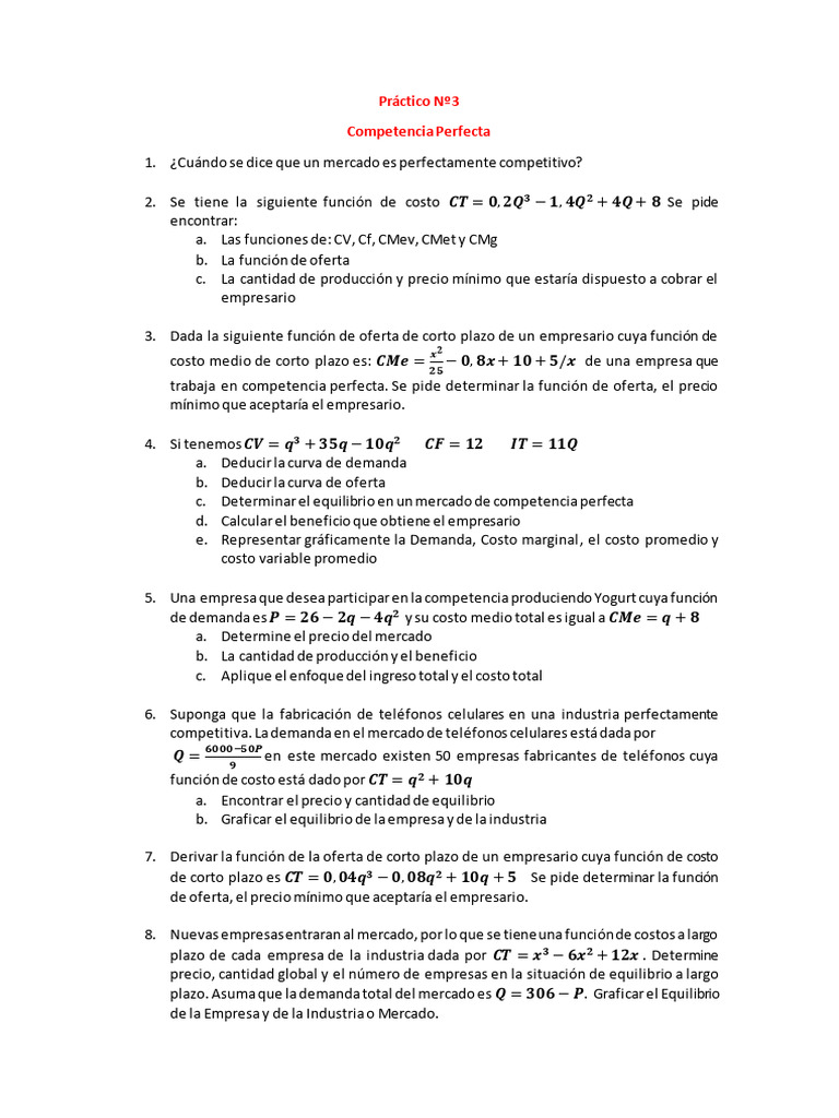 trabaja en competencia perfecta. Se pide determinar la función de oferta, el precio