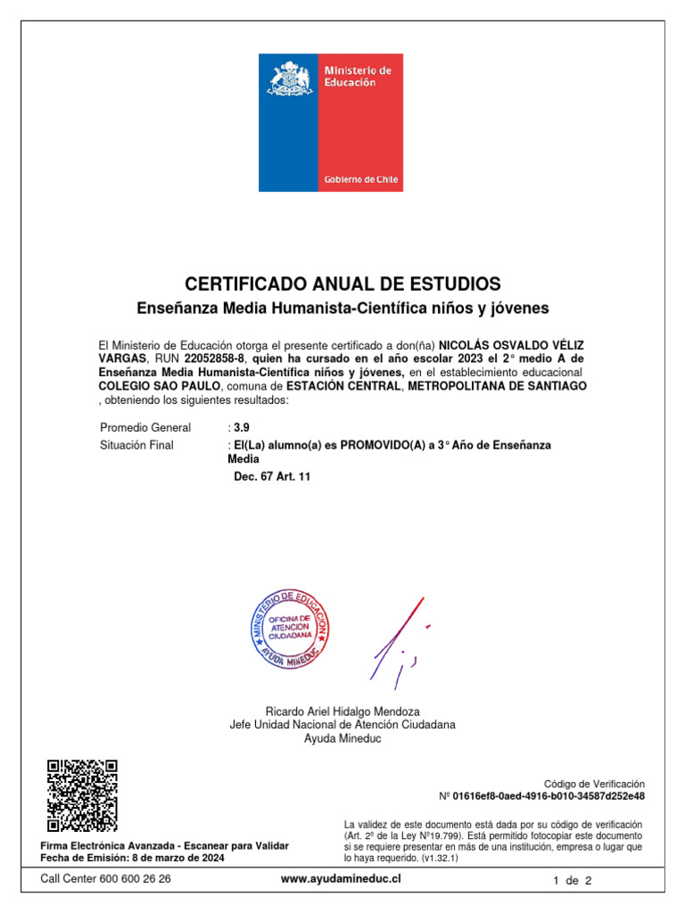 El Ministerio de Educación otorga el presente certificado a don(ña) NICOLÁS OSVALDO VÉLIZ