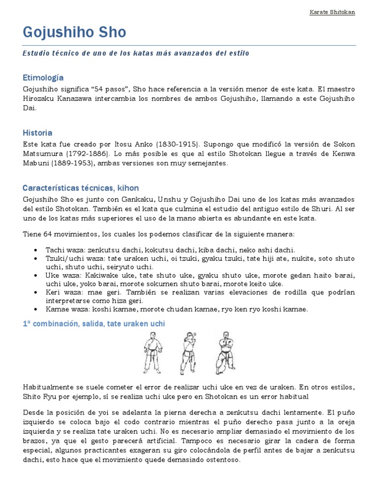 Gojushiho Sho es junto con Gankaku, Unshu y Gojushiho Dai uno de los katas ms avanzados del estilo Shotokan. Tambin es el kata que culmina el estudio del antiguo estilo de Shuri. Al ser uno de los katas ms superiores el uso de la mano abierta es abundante en este kata. Tiene 64 movimientos, los cuales los podemos clasificar de la siguiente manera: Tachi waza: zenkutsu dachi, kokutsu dachi, kiba dachi, neko ashi dachi. Tzuki/uchi waza: tate uraken uchi, oi tzuki, gyaku tzuki, tate hiji ate, nukite, soto shuto uchi, shuto uchi, seiryuto uchi. Uke waza: Kakiwake uke, tate shuto uke, gyaku shuto uke, morote gedan haito barai, uchi uke, yoko barai, morote sokumen shuto barai, morote keito uke. Keri waza: mae geri. Tambin se realizan varias elevaciones de rodilla que podran interpretarse como hiza geri. Kamae waza: koshi kamae, morote chudan kamae, ryo ken ryo koshi kamae.
