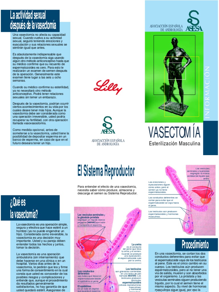 La vasectoma es una operacin simple, segura y efectiva que hace estril a un hombre (ya no puede engendrar un hijo). Considerada como ireversible, la vasectoma es una decisin muy importante. Usted y su pareja deben entender todos los hechos y juntos, tomar la decisin. La vasectoma es una operacin ambulatoria (sin internamiento) que debe hacerse en una clnica o en un hospital. Varios das antes de la vasectoma, le pedirn que lea y firme una forma de consentimiento en la cual consta que usted es conocedor de los posibles riesgos y complicaciones y entiende que, aunque el procedimiento da resultados generalmente satisfactorios, no hay garanta de que usted quedar estril. Asegrese de aclarar todas sus dudas, antes de firmar este formulario.