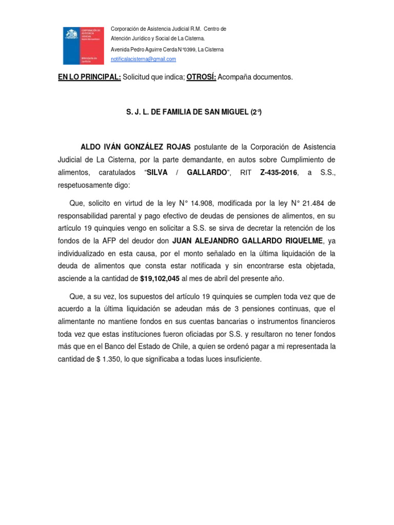 Que, solicito en virtud de la ley N° 14.908, modificada por la ley N° 21.484 de