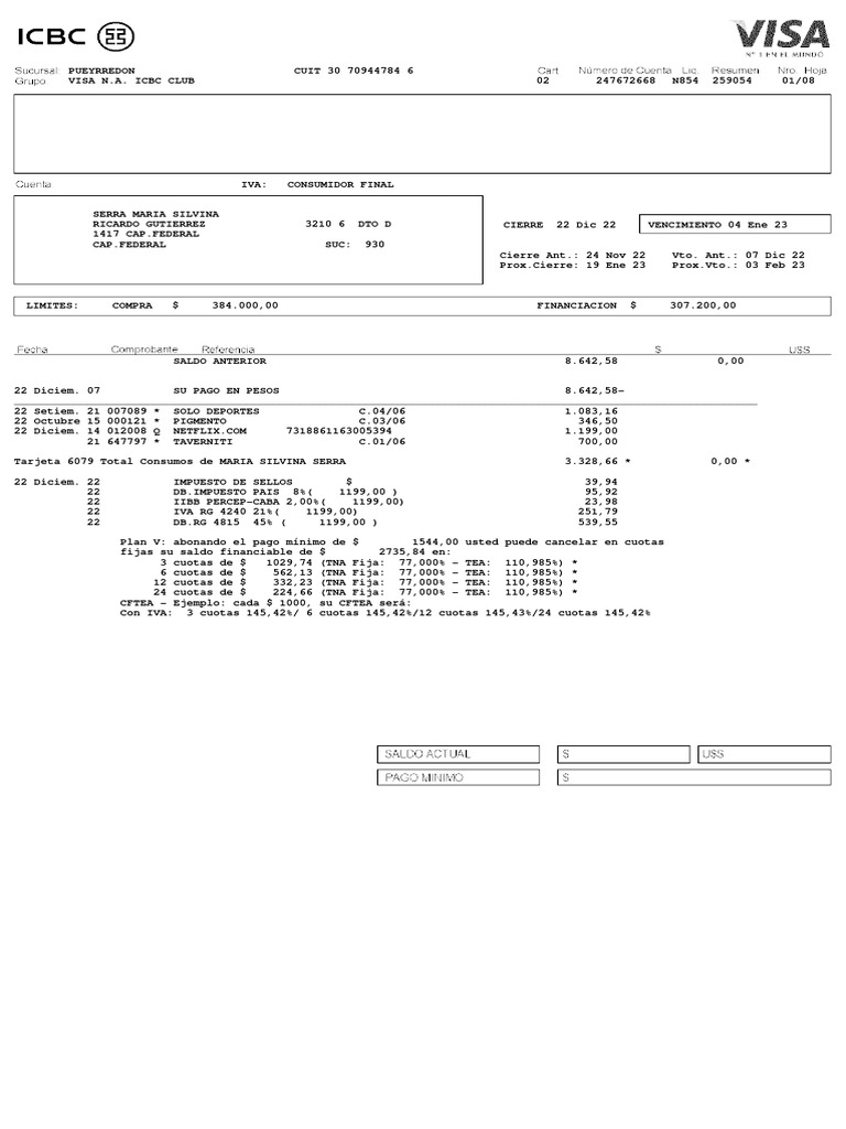 Tarjeta 6079 Total Consumos de MARIA SILVINA SERRA 3.328,66 * 0,00 *