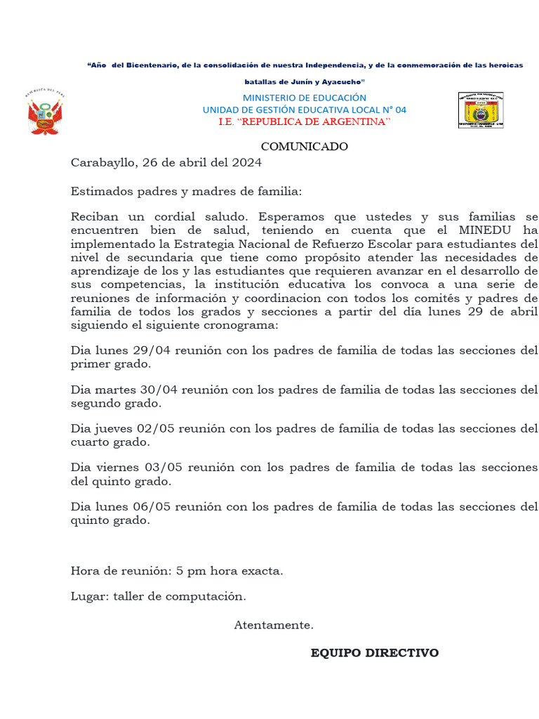Dia martes 30/04 reunión con los padres de familia de todas las secciones del