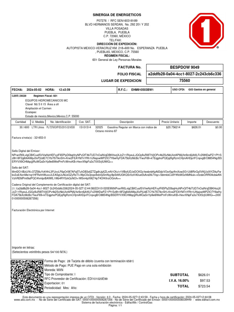 30.1600 LTR Litros PL/7276/EXP/ES/2015-3216530 15101514 32025 Gasolina Regular sin Marca con indice de $20.756214 $626.01 $0.00