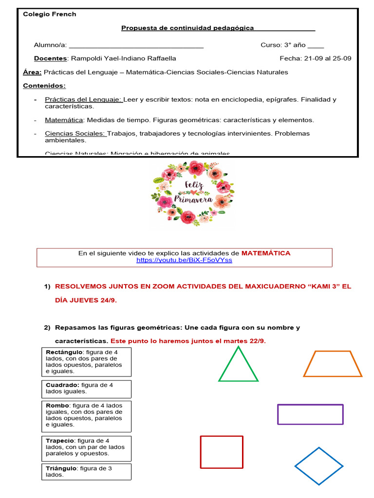 - Matemática: Medidas de tiempo. Figuras geométricas: características y elementos.