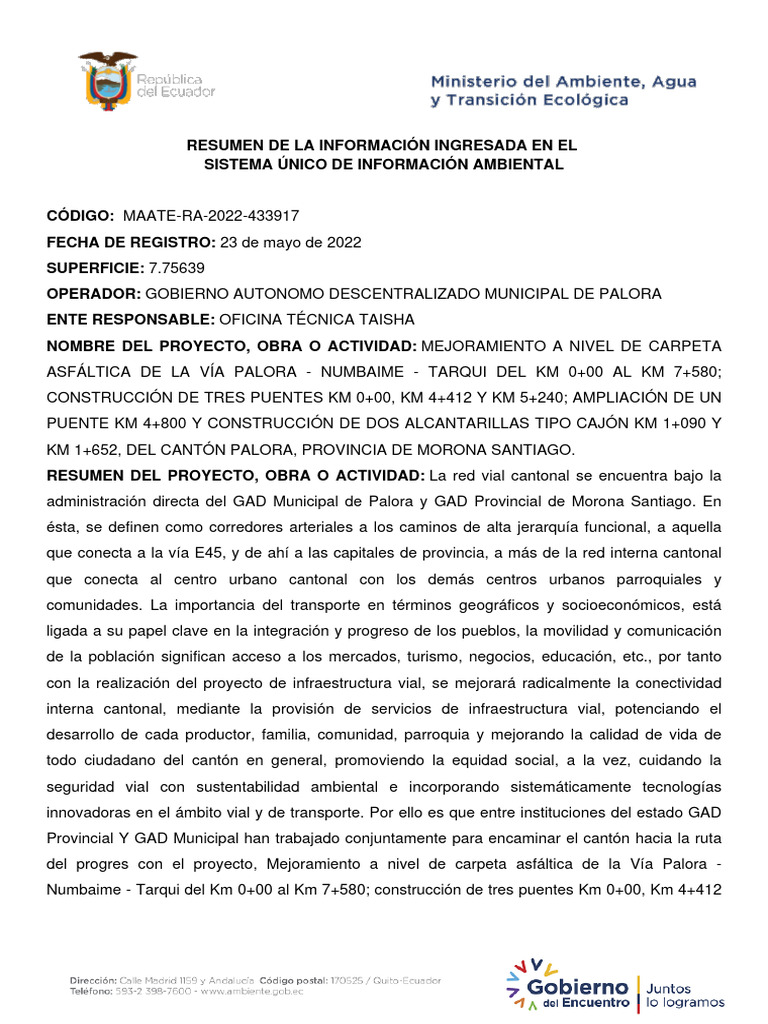 KM 1+652, DEL CANTÓN PALORA, PROVINCIA DE MORONA SANTIAGO.