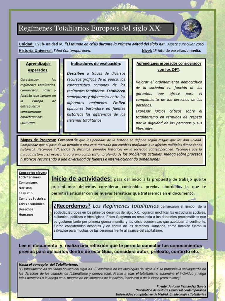 Cmo crees t que los regmenes totalitarios modificaron la panormica poltica, econmica, social e ideolgica en Europa durante los primeros decenios del siglo XX? Se respetaron los derechos de las personas y las bases democrticas? Desarrolla la pregunta en base a tus conocimientos y lo aplicado durante el proceso de esta gua. Finalizado este proceso te propondr, realizar una ponencia apoyado con un ppt o un escrito en que permita evidenciar todo lo que has implementado durante el desarrollo de la propuesta.