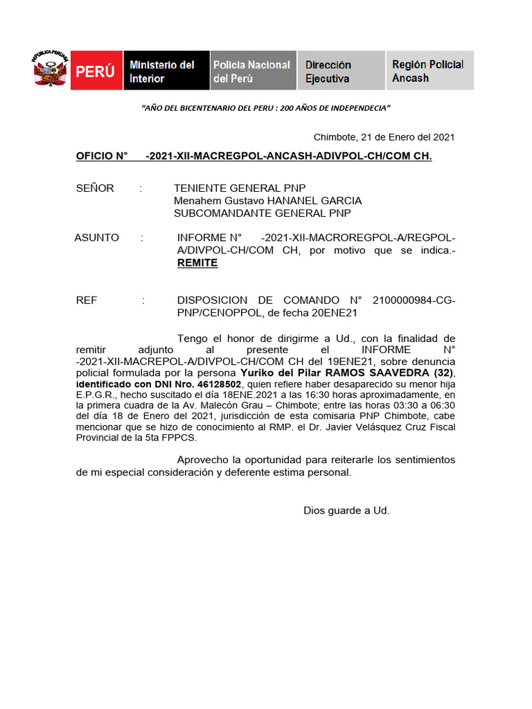 INFORME N° -2021-XII MACREPOL-ANCASH/DIVPOL -CH/COM.CHIMBOTE