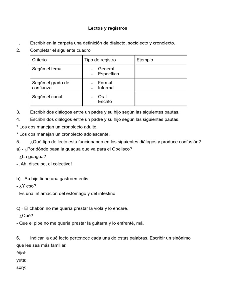 6. Indicar a qué lecto pertenece cada una de estas palabras. Escribir un sinónimo