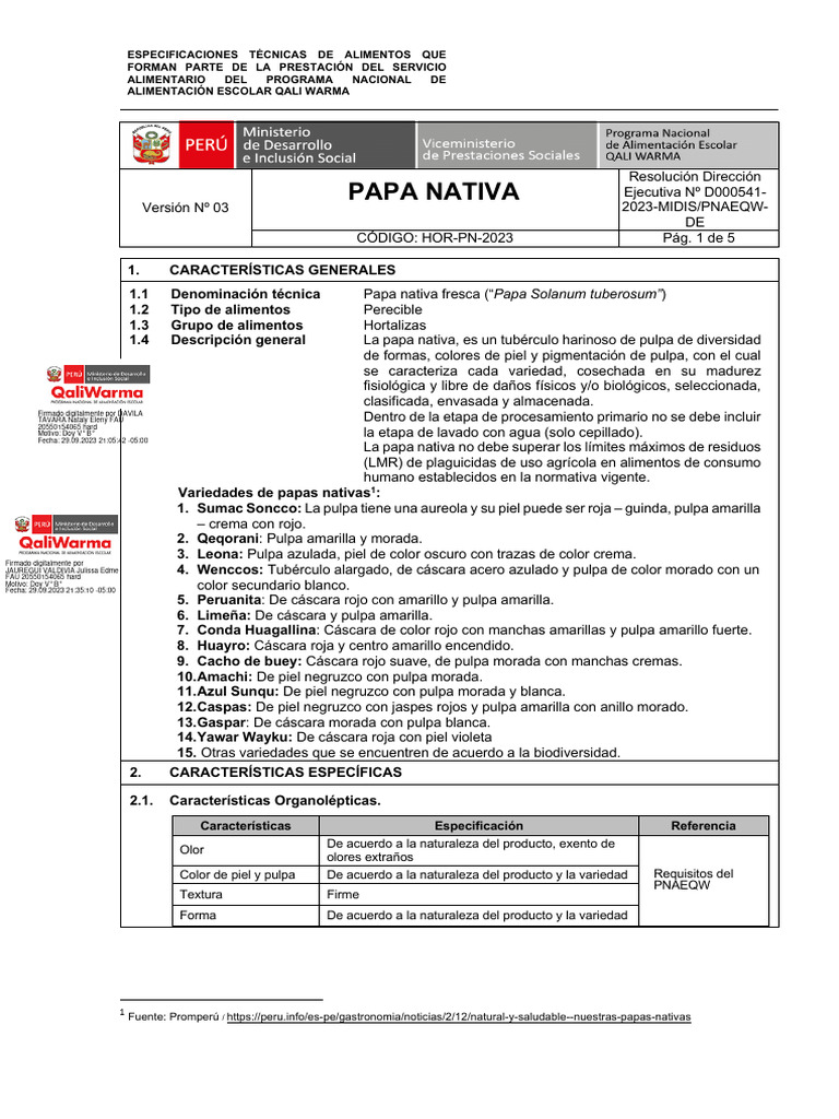 1.1 Denominación técnica Papa nativa fresca (“Papa Solanum tuberosum”)
