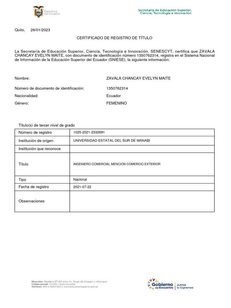 La Secretaría de Educación Superior, Ciencia, Tecnología e Innovación, SENESCYT, certifica que ZAVALA