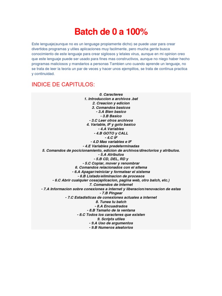 0. Caracteres 1. Introduccion a archivos .bat 2. Creacion y edicion 3. Comandos basicos - 3.A Bien basico - 3.B Basico - 3.C Leer otros archivos 4. Variable, IF y goto basico - 4.A Variables - 4.B GOTO y CALL - 4.C IF - 4.D Mas variables e IF - 4.E Variables predeterminadas 5. Comandos de pocicionamiento, edicion de archivos/directorios y atributos. - 5.A Atributos - 5.B CD, DEL, RD y - 5.C Copiar, mover y renombrar 6. Comandos relacionados con el sitema - 6.A Apagar/reiniciar y formatear el sistema - 6.B Listado/eliminacion de procesos - 6.C Abrir cualquier cosa(aplicacion, pagina web, otro batch, etc.) 7. Comandos de internet - 7.A Informacion sobre conexiones a internet y liberacion/renovacion de estas - 7.B Pingear - 7.C Estadisticas de conexiones actuales a internet 8. Tunea tu batch - 8.A Encuadrados - 8.B Tamao de la ventana - 8.C Todos los caracteres que existen 9. Scripts utiles - 9.A Uso de argumentos - 9.B Numeros aleatorios