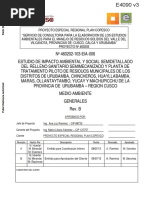 1.2. Diagnstico Ambiental del Proyecto (situacin con proyecto). En general el impacto ambiental con proyecto genera lo siguiente: Mejora de las condiciones de vida de la poblacin. Facilita el transporte de su produccin agropecuaria a la localidad de Chabarbamba, donde se acopia para de aqu ser transportado a los grandes mercados. Utilizacin de la mano de obra local en la construccin del proyecto, generando sus ingresos econmicos temporales. Los costos por fletes de transporte de carga y de pasajeros se reducen. Se reducen los tiempos de transporte ante peligros de prdida de vidas humanas por emergencias de salud. La pequea zona de deslizamiento se puede controlar con la construccin de cuentas de drenaje y mantenimiento de la misma, as tambin con la implementacin de un recubrimiento con arbustos y plantas en esta toda esta zona. 2. CONCLUSIONES Del diagnostico ambiental entre la situacin con Proyecto y Sin Proyecto, se concluye que no se alteraran las condiciones inciales del medio ambiente. El proyecto es AMBIENTALMENTE VIABLE, por lo que se recomienda su intervencin. 3. RECOMENDACIONES (Posibles impactos negativos y medidas de control ambiental). Contaminacin del suelo, por almacenamiento de combustibles y estacionamiento de la maquinaria pesada. Medida de control ambiental: Eliminacin del suelo contaminado enterrndolo a ms de 2m de profundidad y/o el uso de plsticos en el almacn de combustibles. Generacin de Focos Infecciosos, por la disposicin de excretas al aire libre. Medida de control ambiental: construccin de letrinas para personal de obra. Fuertes ruidos, por la utilizacin de maquinaria pesada y uso de material explosivo. Medida de control ambiental: Los obreros utilizarn tapones para los odos. Derrumbes y Deslizamientos, por el estancamiento del agua al no contar con obras de drenaje transversal y longitudinal. Medida de control ambiental: Construccin de cunetas longitudinales sin revestir y capa de afirmado con bombeo transversal del 2%, construccin de muros secos de sostenimiento de piedra, as como arborizar puntos crticos con plantaciones nativas locales.