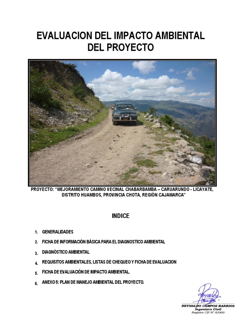 1. GENERALIDADES 2. FICHA DE INFORMACIN BSICA PARA EL DIAGNOSTICO AMBIENTAL 3. DIAGNSTICO AMBIENTAL 4. REQUISITOS AMBIENTALES, LISTAS DE CHEQUEO Y FICHA DE EVALUACION 5. FICHA DE EVALUACIN DE IMPACTO AMBIENTAL. 6. ANEXO 5: PLAN DE MANEJO AMBIENTAL DEL PROYECTO.