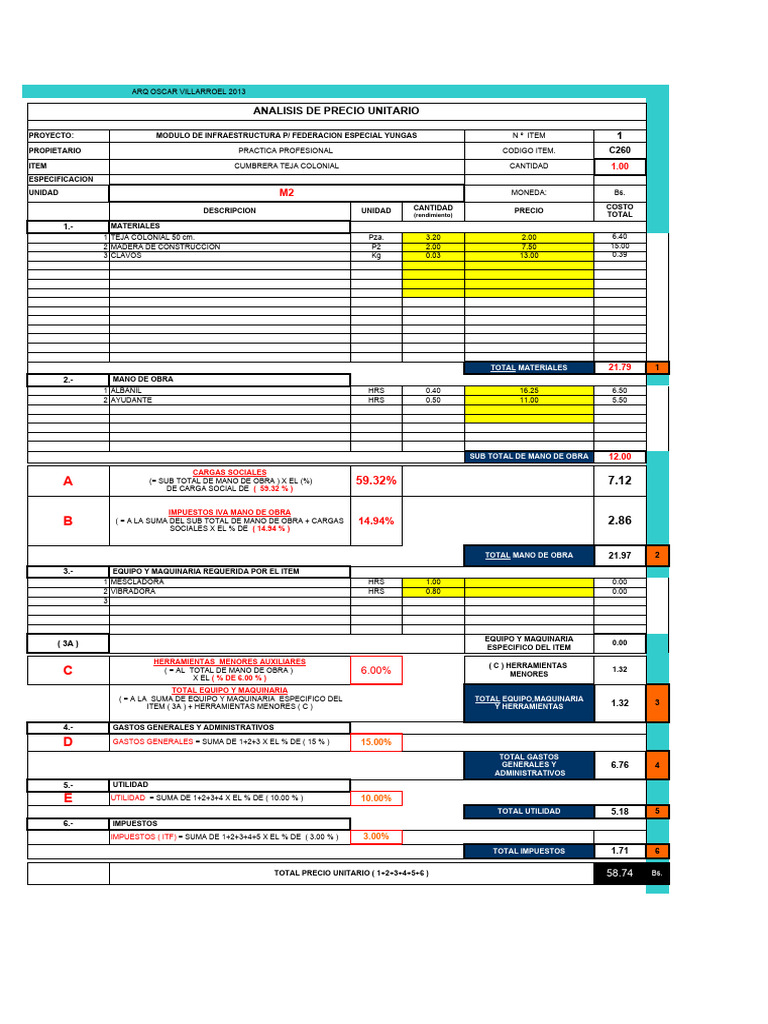 TOTAL PRECIO UNITARIO ( 1+2+3+4+5+6 ) 58.74 Bs.