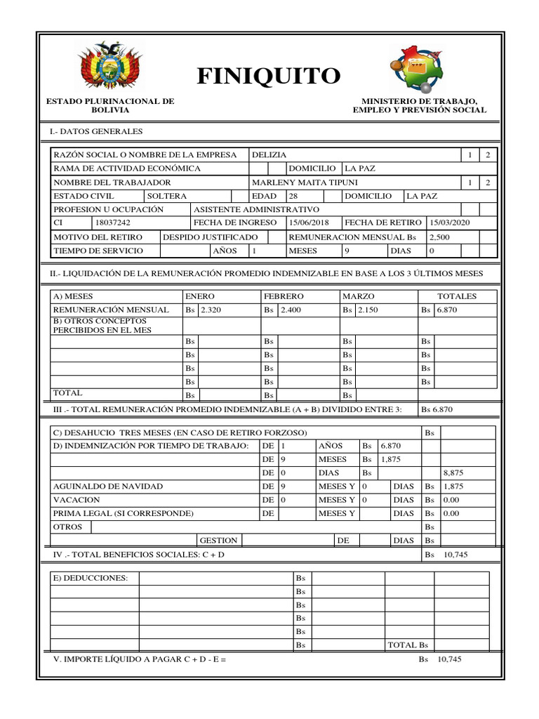 MOTIVO DEL RETIRO DESPIDO JUSTIFICADO REMUNERACION MENSUAL Bs 2,500