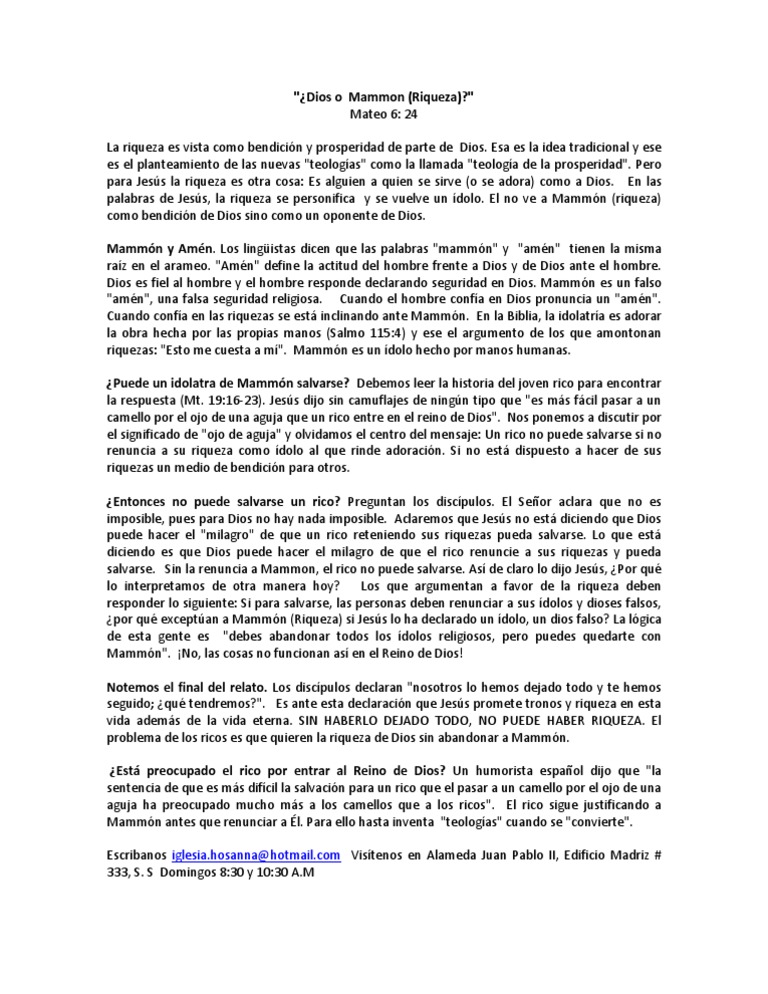 Esa es la idea tradicional y ese es el planteamiento de las nuevas "teologas" como la llamada "teologa de la prosperidad". Pero para Jess la riqueza es otra cosa: Es alguien a quien se sirve (o se adora) como a Dios. En las palabras de Jess, la riqueza se personifica y se vuelve un dolo. El no ve a Mammn (riqueza) como bendicin de Dios sino como un oponente de Dios. Mammn y Amn. Los lingistas dicen que las palabras "mammn" y "amn" tienen la misma raz en el arameo. "Amn" define la actitud del hombre frente a Dios y de Dios ante el hombre. Dios es fiel al hombre y el hombre responde declarando seguridad en Dios. Mammn es un falso "amn", una falsa seguridad religiosa. Cuando el hombre confa en Dios pronuncia un "amn". Cuando confa en las riquezas se est inclinando ante Mammn. En la Biblia, la idolatra es adorar la obra hecha por las propias manos (Salmo 115:4) y ese el argumento de los que amontonan riquezas: "Esto me cuesta a m". Mammn es un dolo hecho por manos humanas. Puede un idolatra de Mammn salvarse? Debemos leer la historia del joven rico para encontrar la respuesta (Mt. 19:16-23). Jess dijo sin camuflajes de ningn tipo que "es ms fcil pasar a un camello por el ojo de una aguja que un rico entre en el reino de Dios". Nos ponemos a discutir por el significado de "ojo de aguja" y olvidamos el centro del mensaje: Un rico no puede salvarse si no renuncia a su riqueza como dolo al que rinde adoracin. Si no est dispuesto a hacer de sus riquezas un medio de bendicin para otros. Entonces no puede salvarse un rico? Preguntan los discpulos. El Seor aclara que no es imposible, pues para Dios no hay nada imposible. Aclaremos que Jess no est diciendo que Dios puede hacer el "milagro" de que un rico reteniendo sus riquezas pueda salvarse. Lo que est diciendo es que Dios puede hacer el milagro de que el rico renuncie a sus riquezas y pueda salvarse. Sin la renuncia a Mammon, el rico no puede salvarse. As de claro lo dijo Jess, Por qu lo interpretamos de otra manera hoy? Los que argumentan a favor de la riqueza deben responder lo siguiente: Si para salvarse, las personas deben renunciar a sus dolos y dioses falsos, por qu exceptan a Mammn (Riqueza) si Jess lo ha declarado un dolo, un dios falso? La lgica de esta gente es "debes abandonar todos los dolos religiosos, pero puedes quedarte con Mammn". No, las cosas no funcionan as en el Reino de Dios! Notemos el final del relato. Los discpulos declaran "nosotros lo hemos dejado todo y te hemos seguido; qu tendremos?". Es ante esta declaracin que Jess promete tronos y riqueza en esta vida adems de la vida eterna. SIN HABERLO DEJADO TODO, NO PUEDE HABER RIQUEZA. El problema de los ricos es que quieren la riqueza de Dios sin abandonar a Mammn. Est preocupado el rico por entrar al Reino de Dios? Un humorista espaol dijo que "la sentencia de que es ms difcil la salvacin para un rico que el pasar a un camello por el ojo de una aguja ha preocupado mucho ms a los camellos que a los ricos". El rico sigue justificando a Mammn antes que renunciar a l. Para ello hasta inventa "teologas" cuando se "convierte". Escribanos iglesia.hosanna@hotmail.com Vistenos en Alameda Juan Pablo II, Edificio Madriz # 333, S. S Domingos 8:30 y 10:30 A.M