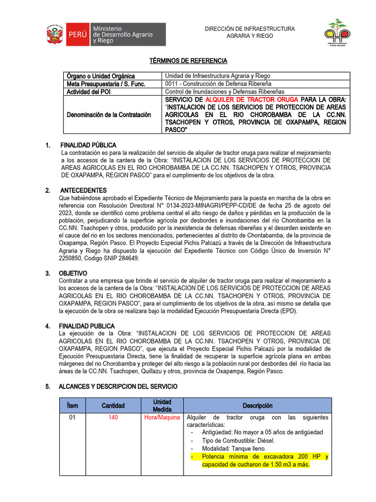 DE OXAPAMPA, REGION PASCO” para el cumplimiento de los objetivos de la obra.